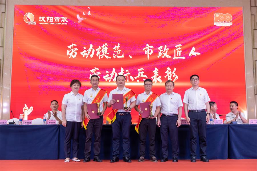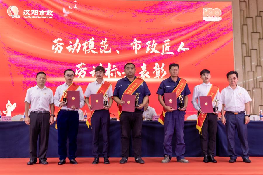 黃桂華宣讀《武漢市漢陽市政建設集團有限公司關于2021年勞動模范、市政匠人、勞動標兵的表彰決定》,授予李磊、盧偉、曹元鑫等3名同志“勞動模范”榮譽稱號;授予章聰、林志剛、姜昊、顏春生、吳鈺梁等5名同志“市政匠人”榮譽稱號;授予龍繼光、張青、劉海軍、徐軍濤、李海華等5名同志“勞動標兵”榮譽稱號。