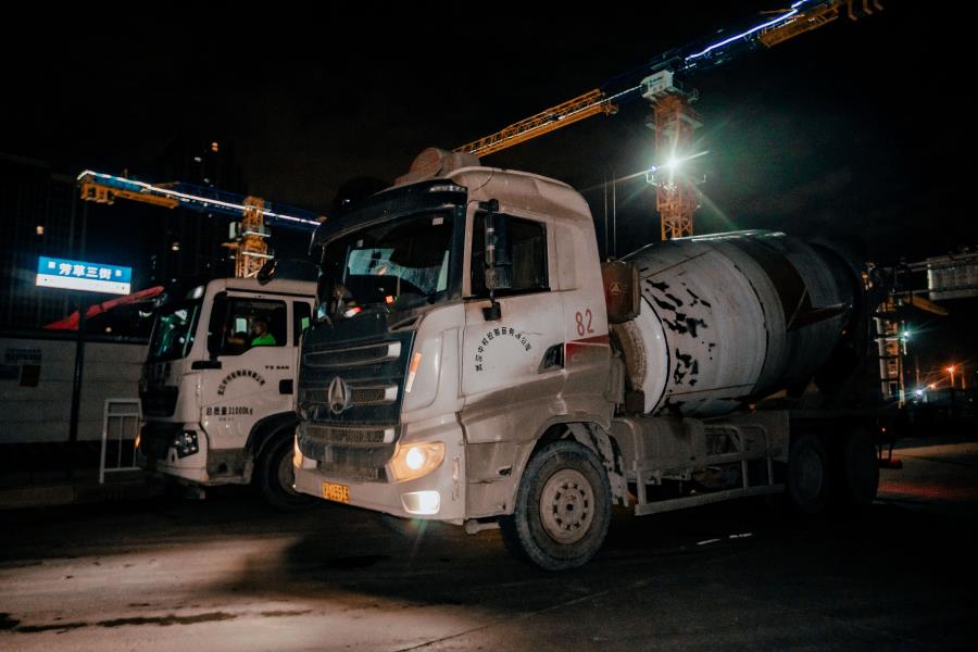 連續48小時內澆筑6500立方米混凝土,局部區域深度達7.7米,這種高強度、高難度大體積混凝土澆筑,對現場人、機、料、法、環各個環節要求極高。本次澆筑采用3臺天泵車、1臺地泵,配備50臺混凝土罐車來回持續運輸混凝土,以保證現場施工的順利完成。