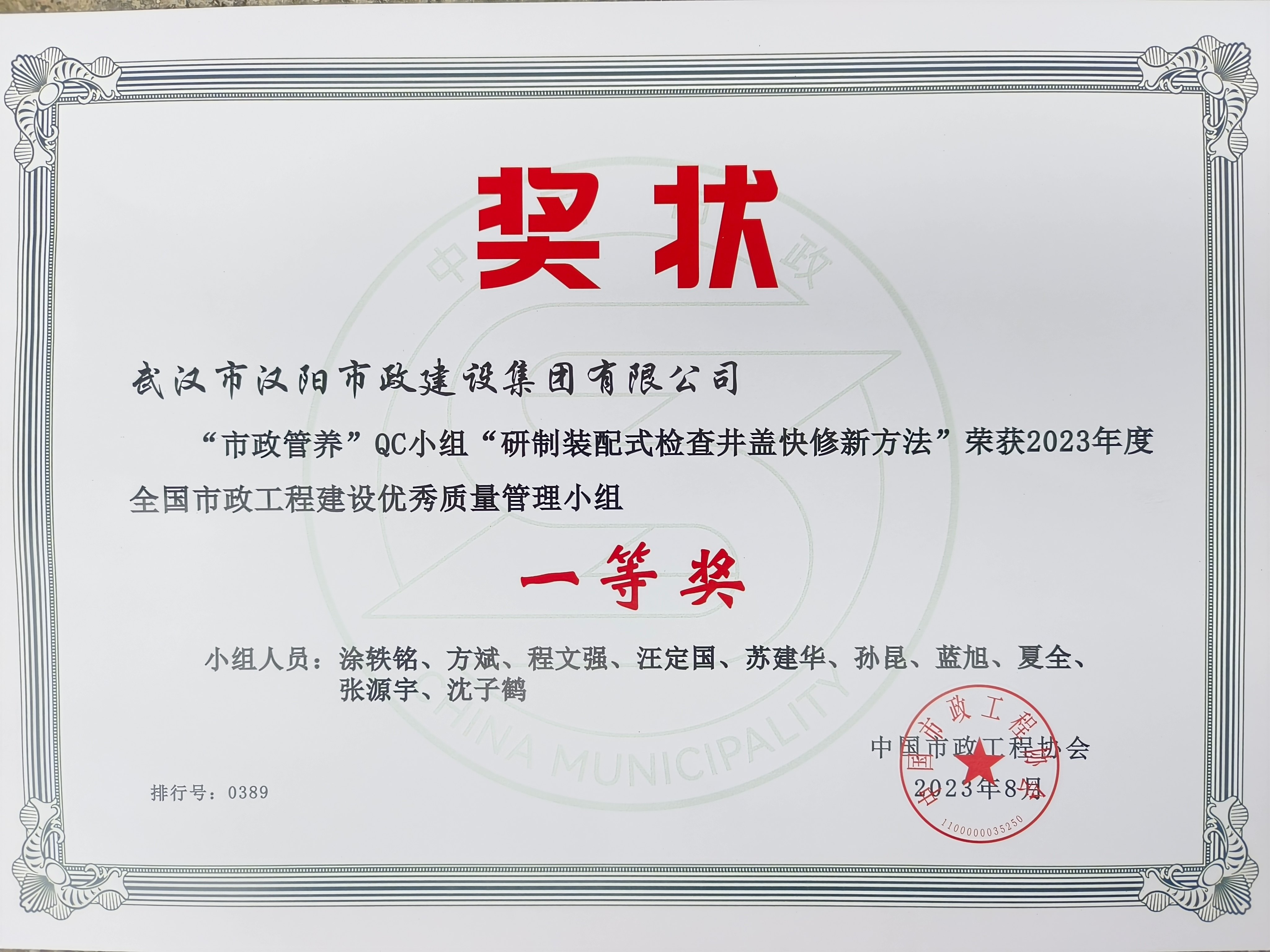 最終,通過查閱檢查井相關(guān)資料、實地勘測勘察、試驗分析,沈子鶴團隊探索出一套裝配式檢查井蓋快速維修施工新技術(shù)。此項針對傳統(tǒng)維修技術(shù)存在的井蓋座易變形、施工完成后養(yǎng)護期長、質(zhì)量難把控等問題進行改進,采用T型“六防”井蓋與道路同色混凝土預制裝配形成整體,相對常規(guī)維修方案使井蓋底座與原路面凹槽受力面擴大,可以很好地解決檢查井區(qū)域不均勻沉降的問題;同時,其安裝速度快,可很好適應(yīng)道路維修施工作業(yè)時間短的特殊情況。目前裝配式檢查井近千座應(yīng)用試點效果良好,優(yōu)化工藝降本增效。“ 研制裝配式檢查井蓋快修新方法”獲中國市政工程協(xié)會一等獎、湖北省市政工程協(xié)會一等獎;“裝配式檢查井蓋快修工藝研發(fā)”獲湖北省建設(shè)工程質(zhì)量安全協(xié)會一等獎。